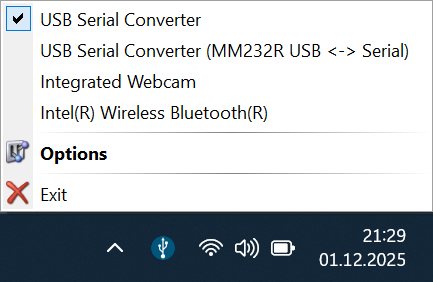 Use the options dialog to configure which USB devices should be forwarded to WSL 2. Alternatively, you can use the menu in the systray to connect or disconnect devices.