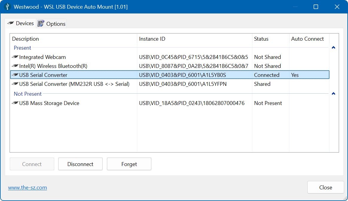 Use the options dialog to configure which USB devices should be forwarded to WSL 2. Alternatively, you can use the menu in the systray to connect or disconnect devices.